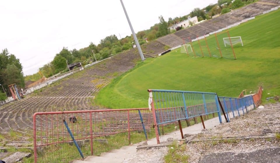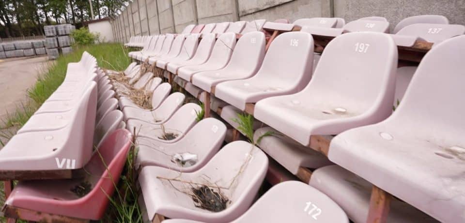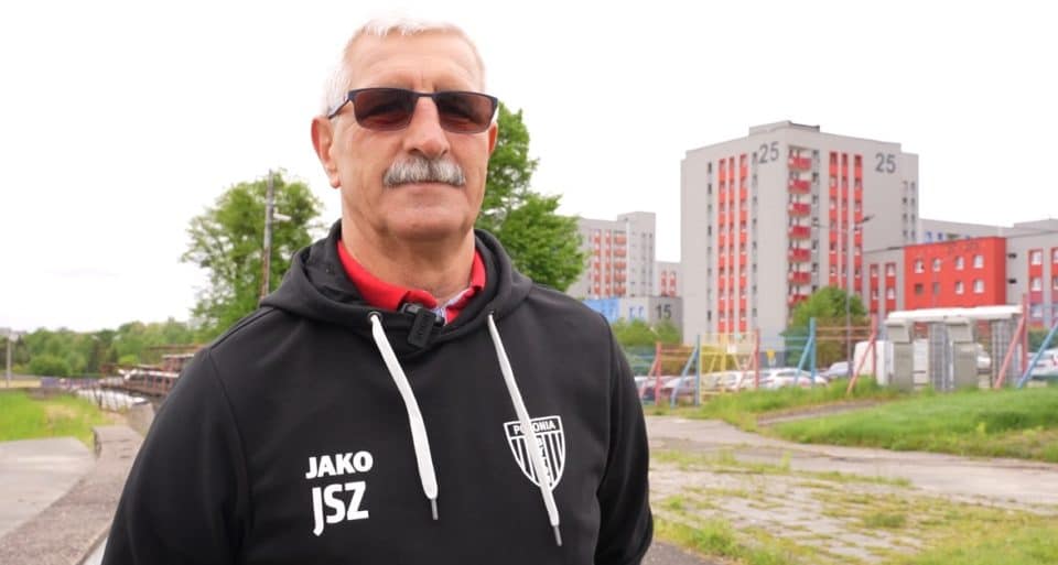 Bytom nie jest najpiękniejszym miastem w Polsce, ale ma swój urok. Stare bloki, część sklepów żywcem przypominających czasy słusznie minione, raczej monochromatyczna zabudowa. Nie odraża – bardziej fascynuje. W wehikuł czasu wsiadamy jednak dopiero po dotarciu na stadion. Pobliskie bloki, z których balkonów śmiało można oglądać mecze Polonii, pomalowano na jej barwy, ale na samym obiekcie trudno je dostrzec. Jeśli pamiętacie Polonię z Ekstraklasy, na pewno kojarzycie trybunę z prowizorycznym dachem oraz niebiesko-czerwonymi krzesełkami. Dziś już nie ma ani tego, ani tego. Wszystko przez nieudaną modernizację obiektu w 2018. Modernizację, która skończyła się… na rozbiórce. Wykonawca niedługo później się zawinął, a sprawa do teraz zalega w sądach. Na domiar złego teren legendarnego stadionu został objęty zastawem na hipotece, więc nie chcąc tracić czasu, władze klubu i miasta stawiają nowy tuż obok.