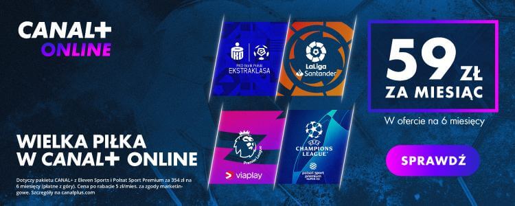 Online mecz możemy obejrzeć także w inny sposób. Możemy skorzystać z usługi CANAL+ online, która teraz dostępna jest w promocyjnej cenie. Decydując się na półroczny dostęp do pakietu obejmującego wszystkie kanały CANAL+, Eleven Sports i Polsat Sport Premium zapłacimy 354 zł zamiast 414 zł. Daje to tylko 59 zł miesięcznie. Aby skorzystać z oferty należy zarejestrować konto za pośrednictwem naszej strony.