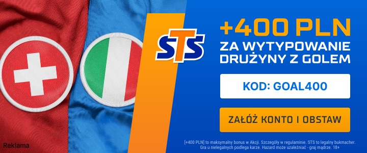 Promocja w STS na bramkę Szwajcarów bądź reprezentacji Włoch po kursie 200.00 dostępna jest wyłącznie dla nowych użytkowników, którzy dokonają rejestracji z kodem GOAL400. Po założeniu konta STS wymaga jeszcze wpłaty co najmniej 50 zł i postępowania wedle kilku kolejnych prostych kroków.