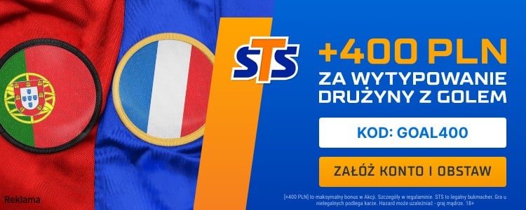 Warto jednak skorzystać z oferty STS. Bukmacher przygotował na ten mecz specjalną promocję. Rejestrując konto w STS z kodem promocyjnym GOAL400 będziesz mógł zgarnąć extra bonus 400 zł za wytypowanie drużyny, która zdobędzie w tym spotkaniu przynajmniej jednego gola.