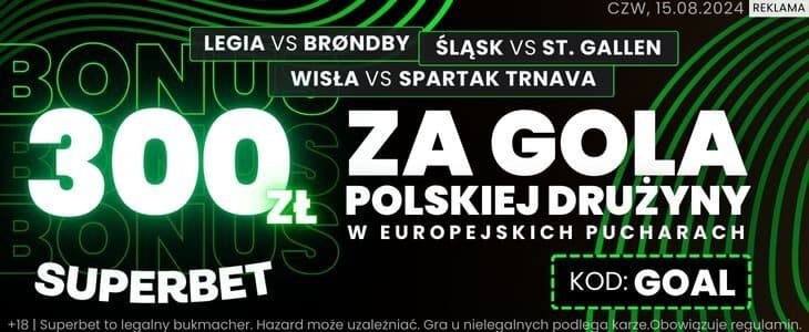 Nieznacznym faworytem czwartkowego meczu są goście, którzy wyglądali dużo lepiej w pierwszym spotkaniu rozegranym w Szwajcarii. Kurs na wygraną Śląska Wrocław wynosi mniej więcej 2.65, a typ na zwycięstwo FC Sankt Gallen to około 2.45. Kurs na remis bukmacherzy wyceniają na mniej więcej 3.50. Najwyższy bonus powitalny w Superbet (3755 zł + 600 zł) odbierzesz z kodem GOAL.