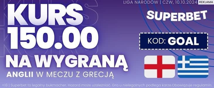 Superbet na czwartkowy mecz przygotował specjalną ofertę. Rejestrując konto z kodem GOAL będziesz mógł postawić zakład na wygraną Anglii po kursie 150 i zgarnąć dzięki temu bonus w wysokości 300 zł. Jak skorzystać z promocji?
