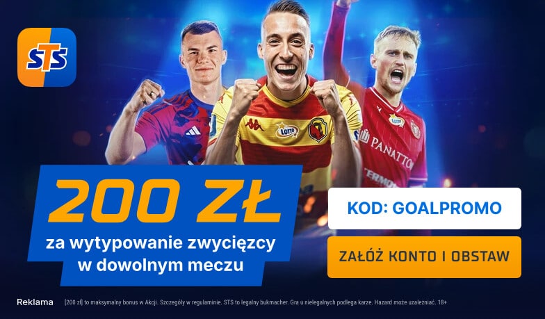 16. kolejkę Ekstraklasy zainauguruje mecz Zagłębia Lubin z Motorem Lublin, a wszystko zwieńczy starcie Puszczy Niepołomice z Widzewem Łódź. Bez względu na to, czy zdecydujesz się obstawić zwycięzcę jednego z tych, czy dowolnego innego meczu, to za poprawny typ możesz otrzymać 200 złotych bonusu od STS. Wymagana jest rejestracja z kodem promocyjnym o treści GOALPROMO oraz spełnienie opisanych warunków.