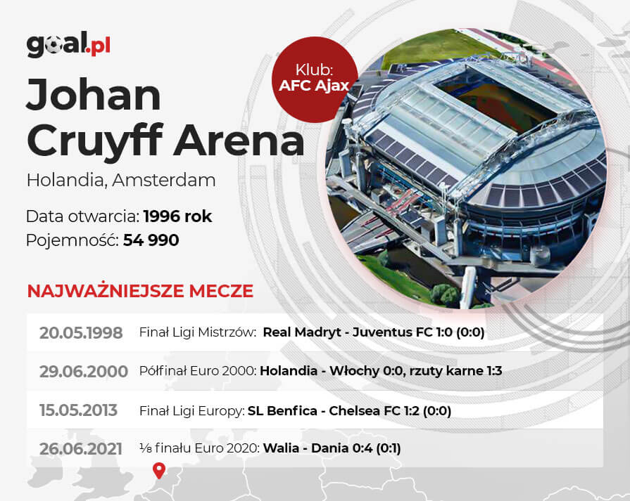 Johan Cruyff Arena to stadion, który powstał w Amsterdamie w latach 1993-96 jako następca De Meer Stadion, gdzie swoje mecze od 1934 do 1996 r. rozgrywał Ajax. Początkowo nowy obiekt nosił nazwę Amsterdam ArenA, ale w 2017 r. przemianowano ją na Johan Cruyff Arena, by upamiętnić legendę Ajaksu – Johanna Cruyffa, który zmarł rok wcześniej w wieku 68 lat. Warto wspomnieć, że nowa konstrukcja w Amsterdamie miała powstać znacznie wcześniej, ponieważ miasto ubiegało się o prawo organizacji Igrzysk Olimpijskich w 1992 r. Finalnie Amsterdam przegrał batalię o olimpiadę z Barceloną, a plany wzniesienia nowoczesnego obiektu zostały przesunięte o kilka lat.
