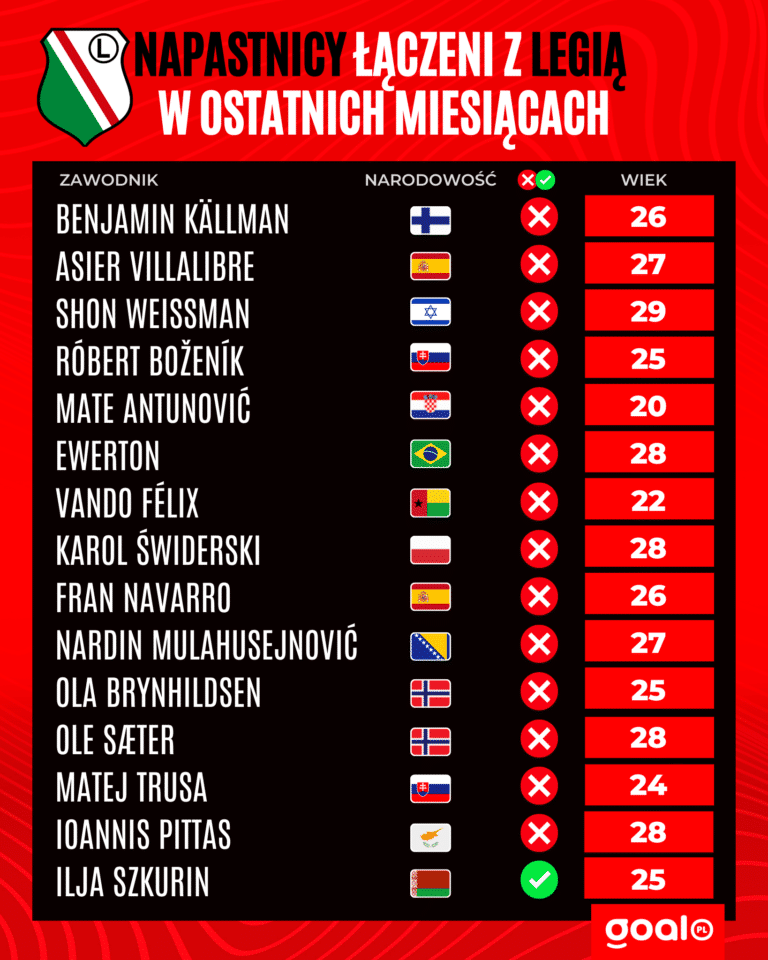 Ale nawet pomijając te wszystkie drobne niedogodności związane z transferami Kallmana i Szkurina, nawet pomijając szyderstwa z „dekoderów” – Legię musi martwić po prostu jakość jej skautingu oraz jakość procedur, które wypracowano w klubie. Oficjalnie legioniści poszukują środkowego napastnika od paru miesięcy, gdy stało się jasne, że pomimo sporych pieniędzy wydanych na Jean-Pierre’a Nsame oraz Miguela Alfarelę, żaden z nich nie stanie się nowym Nemanją Nikoliciem. Ale właśnie – wcześniej przecież Legia też szukała, z pewnością obaj panowie znajdowali się na słynnych shortlistach w towarzystwie innych nazwisk przewidzianych przez Legię jako potencjalni nowi strzelcy goli dla warszawskiego klubu. To razem daje ładnych kilkanaście tygodni intensywnych poszukiwań, to razem daje kawał historii klubu, by przygotować jakieś logiczne kandydatury. W mediach przewijały się nazwiska – jestem wielkim fanem naszej goalowej infografiki, którą przygotowaliśmy na media społecznościowe.