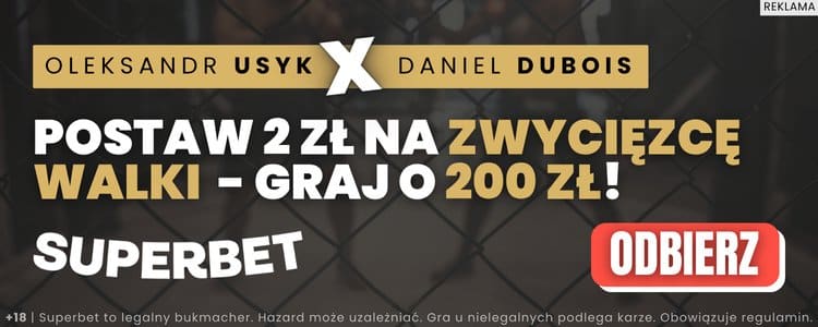 Przy okazji sobotniej walki można skorzystać ze świetnej promocji w Superbet. Bukamcher oferuje nowy klientom możliwość postawienia zakładu na wygraną Usyka lub Dubois po kursie 100.00. Do skorzystania z oferty uprawnia podanie podczas rejestracji konta kodu promocyjnego GOAL. Poniżej wyjaśniamy krok po kroku jak skorzystać z promocji.