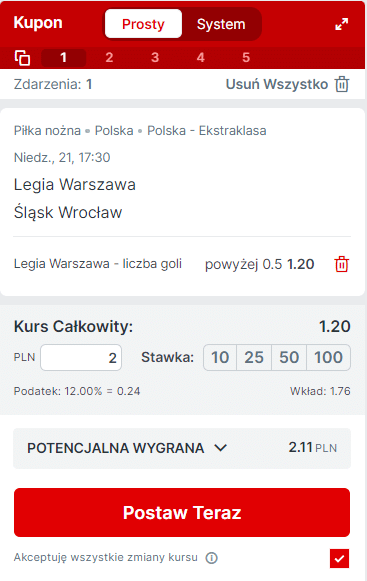 4. Postaw pierwszy zakład SOLO po założeniu konta, na którym znajduje się typ na gola wybranej drużyny w meczu Legia Warszawa – Śląsk Wrocław (typ zakładu: Legia Warszawa Strzeli Gola – tak lub Legia Warszawa – Liczba Goli – powyżej 0.5 lub Śląsk Wrocław Strzeli Gola – tak lub Śląsk Wrocław – Liczba Goli – powyżej 0.5).