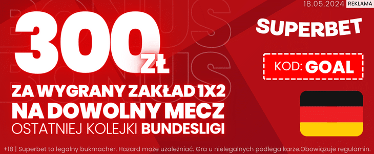 - Superbet oferuje bonus 300 zł za wygrany zakład 1X2 na dowolny mecz 34. kolejki Bundesligi