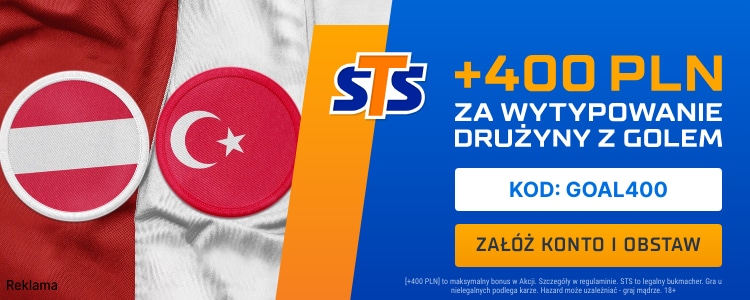 Promocja na gola Austrii lub Turcji po kursie 200.00 jest dostępna tylko dla nowych klientów STS, którzy zdecydowali się założyć konto z kodem promocyjnym GOAL400. Oprócz pozytywnego zakończenia procesu rejestracyjnego będziesz musiał jeszcze dokonać pierwszej wpłaty w kwocie 50 zł oraz postępować wedle ściśle określonych wytycznych.