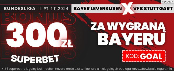 - Superbet oferuje 300 zł bonusu za wygraną Bayeru Leverkusen w tym starciu