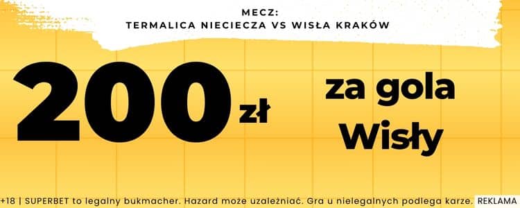 Jeżeli Wisła zdobędzie choćby jednego gola, otrzymasz od Superbet bonus o wartości 200 zł. Przed wypłatą środków, zgodnie z regulaminem, wymagany jest 3-krotny obrót kwotą bonusu na kuponach SOLO lub AKO z kursem łącznym min. 1.91.