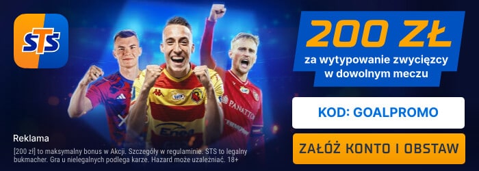 Legalny bukmacher STS znany jest z regularnych promocji, a jedną z najnowszych ofert jest 200 złotych bonusu za wytypowanie zwycięzcy dowolnie wybranego meczu 17. kolejki Ekstraklasy. Skorzystanie z promocji jest możliwe po rejestracji konta z kodem promocyjnym: GOALPROMO oraz spełnieniu pozostałych warunków.