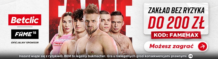 Walki z Fame MMA 18 obstawiać można tylko na Betclic. Z kodem promocyjnym FAMEMAX odbierzesz zakład bez ryzyka do 200 zł w Betclic.