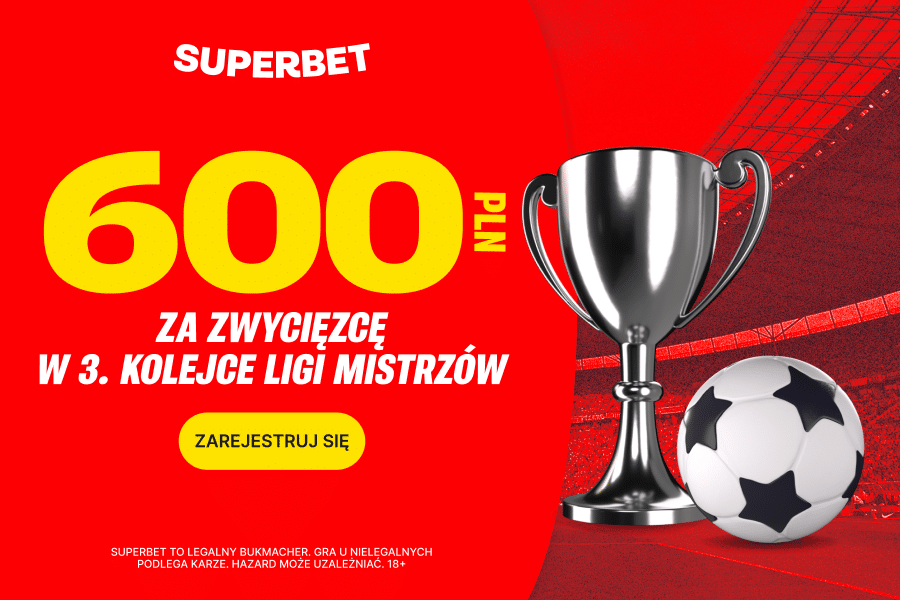 Jeśli Twój typ okaże się trafny, Superbet przekaże na konto bonusowe aż 600 zł, które podlegać będzie warunkom trzykrotnego obrotu na kupony SINGIEL lub AKO o kursie min. 1.91.