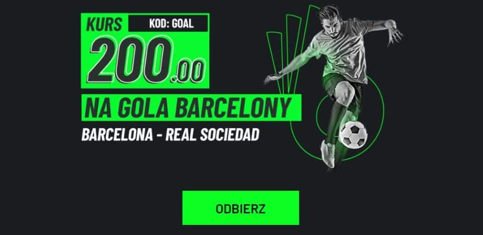 Promocja skierowana jest dla nowych użytkowników. Zarejestruj swoje konto z kodem promocyjnym GOAL i wykorzystaj kurs 200.00 na gola FC Barcelony. Wymagana jest akceptacja zgód marketingowych oraz postawienie stosownego zakładu za min. 1 zł.