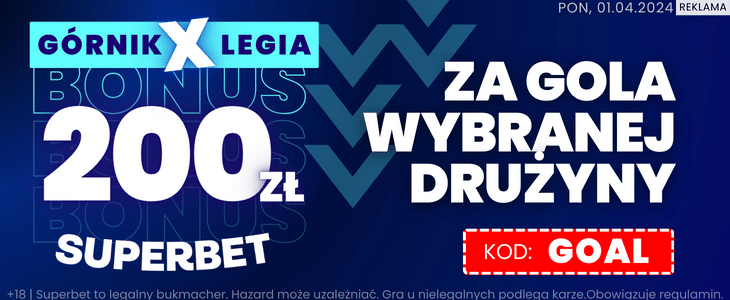 Przed rozpoczęciem spotkania warto zwrócić uwagę na ofertę przygotowaną przez jednego z bukmacherów. Zakładając konto w Superbet z kodem promocyjny GOAL, można obstawić zakład na gola Górnika lub Legii po kursie 100.00. Żeby wziąć udział w promocji, wystarczy spełnić kilka prostych kroków, które objaśniamy poniżej.