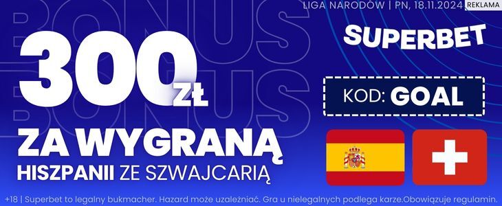 Hiszpania wygrała cztery ostatnie mecze, a w trwającej edycji Ligi Narodów UEFA jeszcze nie przegrała. Nie dziwi więc, że jest faworytem starcia przeciwko Szwajcarii. Załóż konto w Superbet z kodem GOAL, wytypuj wygraną „La Furia Roja” i odbierz 300 złotych bonusu!