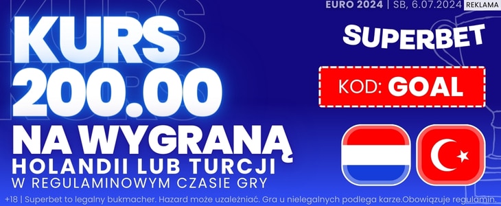 Rejestracja z kodem GOAL w Superbet odblokowuje możliwość zakładu bez ryzyka w pierwszym tygodniu gry u bukmachera. Gdy zdarzy się więc sytuacja, że wskazana przez Ciebie drużyna nie zwycięży w spotkaniu Holandia – Turcja, to bukmacher dokona zwrotu zainwestowanych środków.