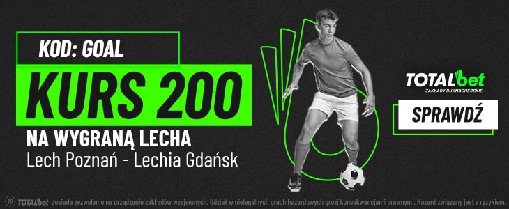 Lech Poznań jest zdecydowanym faworytem nadchodzącego meczu przeciwko Lechii Gdańsk. Stąd też warto zainteresować się ofertą bukmachera TOTALbet. Mowa o kursie 200.00 na zwycięstwo „Kolejorza”. Z promocji skorzystasz po rejestracji z kodem promocyjnym GOAL, akceptacji zgód marketingowych oraz wpłacie dowolnego depozytu. Konieczne jest także wysłanie zakładu za dokładnie 1 złotówkę na zwycięstwo Lecha Poznań. Jeżeli Twój typ okaże się poprawny, TOTALbet dokona rozliczenia zakładu po kursie 200.00.