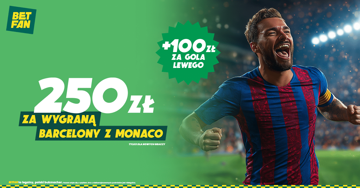 Jeżeli Duma Katalonii pokona AS Monaco, to Betfan przyzna Ci 250 zł w postaci freebetu. Dodatkowe 100 zł trafi na Twoje konto, jeśli jednym ze strzelców bramki dla Blaugrany będzie Robert Lewandowski.