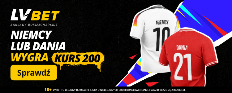 Na zbliżający się mecz 1/8 finału Euro 2024 Niemcy – Dania, LV BET przygotował atrakcyjną promocję, dzięki której zwycięzcę meczu można obstawić po kursie 200.00. Postawienie na triumf którejkolwiek z drużyn może przynieść aż 200 zł bonusu. Warto po niego sięgnąć!
