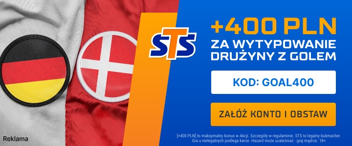 W ofercie firmy STS znalazła się bardzo interesująca promocja na spotkanie Niemcy Dania. W jej ramach można obstawić gola jednej z drużyn po kursie 200.00. Do wygrania jest aż 400 zł w postaci bonusu.