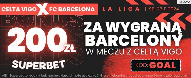 14. kolejka La Liga przyniesie ciekawe starcie na Estadio de Balaídos w Vigo, gdzie miejscowa Celta podejmie FC Barcelonę. Nie ma co ukrywać, że zdecydowanymi faworytami są przyjezdni. Możesz zarejestrować się w Superbet z kodem bonusowym GOAL, wytypować zwycięstwo „Dumy Katalonii” i zgarnąć 200 złotych bonusu.