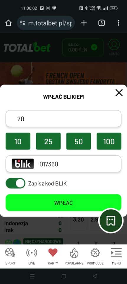 Inną zaletą, z którą nie spotkałem się nigdzie indziej jest możliwość dokonania wpłaty tuż przed postawieniem zakładu. Wystarczy podać kod Blik i zatwierdzić depozyt w swojej aplikacji bankowej. Później bukmacher Totalbet od razu przyjmuje wpłaconą sumę na poczet kuponu i zakład zostaje uznany za zawarty. Cały proces jest bardzo szybki i z pewnością przypadnie do gustu graczom, którzy dokonują częstych wpłat przed puszczeniem kuponu.