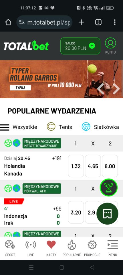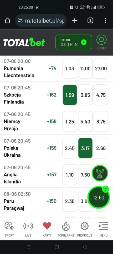 Poruszanie się po apce Totalbetu jest zbyt powolne, żebym mógł swobodnie przeglądać sobie dostępne zdarzenia i porównywać oferty kursowe. Podsumowując, nawigacja mocno kuleje i wolałbym mieć pod ręką znacznie sprawniejszą aplikację mobilną.