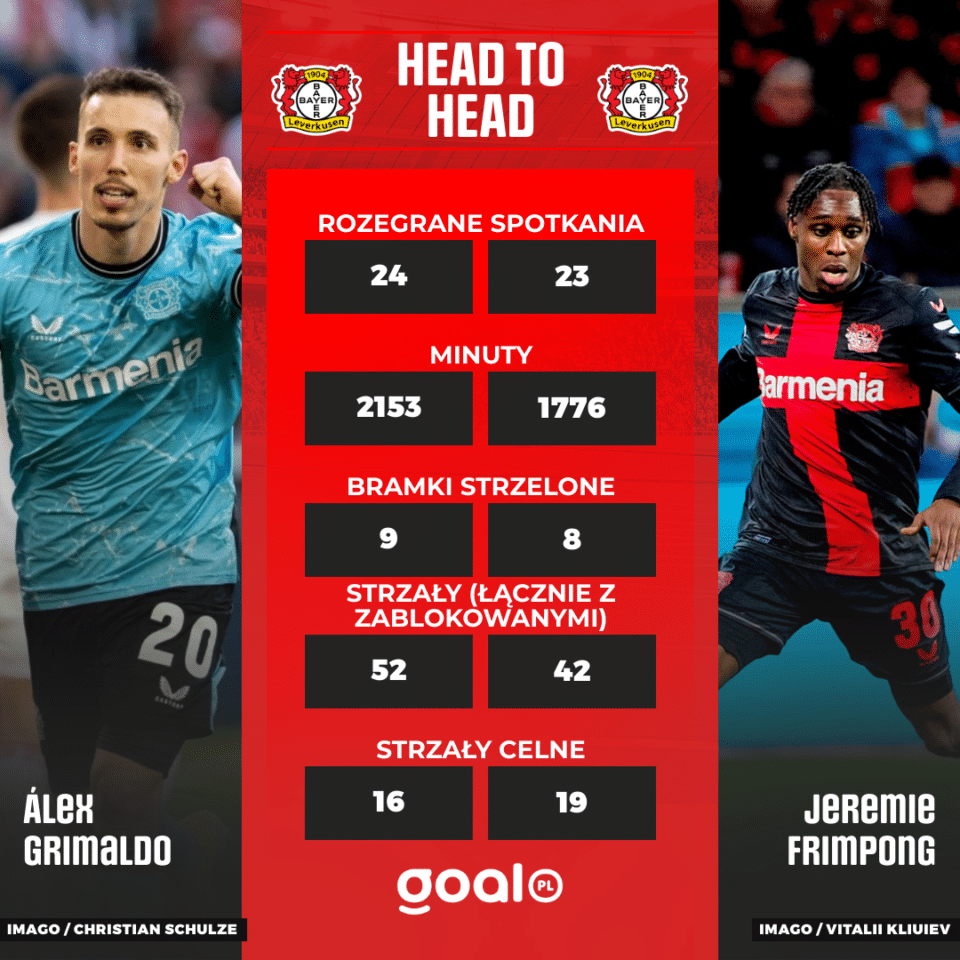 Grimaldo dołączył do Aptekarzy przed obecnym sezonem. Hiszpan dołączył do zespołu Xabiego Alonso z Benfiki na zasadzie wolnego transferu. Z kolei 23-letni Frimpong do Leverkusen trafił w 2021 roku z Celtiku Glasgow. Od tego momentu zagrał w barwach klubu 124 mecze, w których strzelił 20 goli i zaliczył 30 asyst.