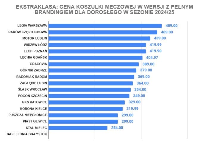 Najwięcej za koszulkę swojego klubu muszą zapłacić kibice Rakowa Częstochowa i Lecha Poznań, po 349 zł. Niewiele mniej kosztują stroje Widzewa Łódź, Legii Warszawa i Motoru Lublin (niecałe 340 zł). Ponad połowa klubów oferuje koszulki w wersji podstawowej poniżej 300 zł, a najtańsza Stal Mielec za 219 zł.