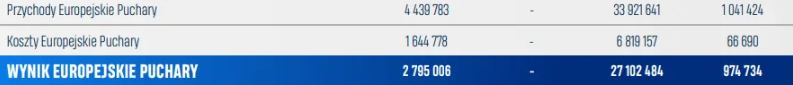 W sekcji dotyczącej europejskich pucharów widzimy niemal 34 mln zł, które pochodzą z gry w Lidze Europy w sezonie 20/21. Wiemy już, że dodatkowe przychody Lecha w tym sezonie wyniosą 55 mln zł, więc o 2/3 więcej.