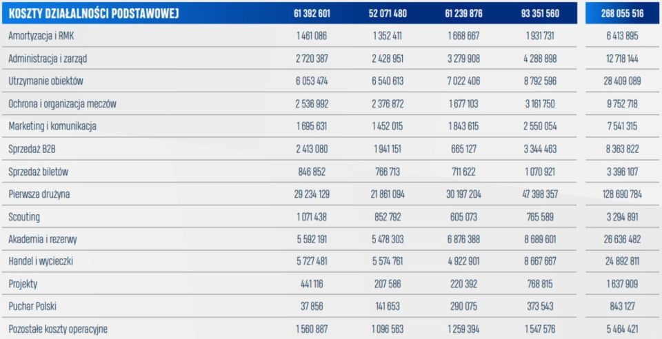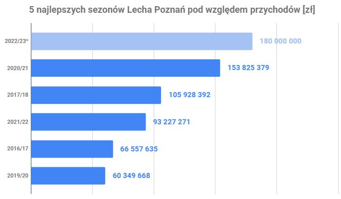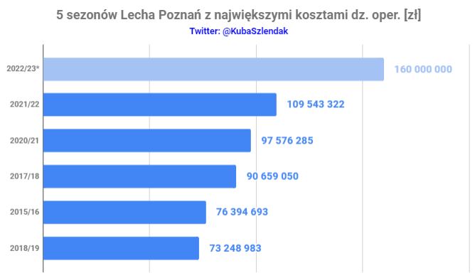 Jednak wiedząc, ile wynosi prognozowany zysk brutto Lecha nasuwa się łączna kwota kosztów klubu na poziomie 160 mln zł. Byłby to najwyższy wynik w historii klubu, pierwszy powyżej 150 mln zł oraz drugi powyżej 100 mln zł. Lech pobiłby swój rekord w tej kwestii po raz trzeci z rzędu przechodząc od kwoty 97.5 mln zł w sezonie 20/21 do ponad 150 mln zł w sezonie 22/23.