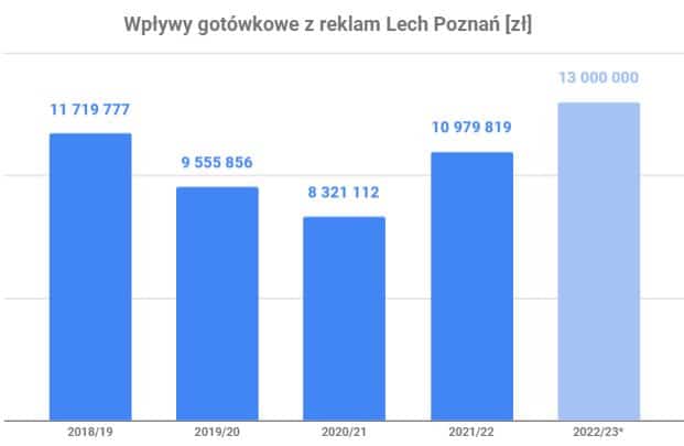 Zrównoważy to spadek wpływów z praw telewizyjnych, które w sezonie 2021/22 były na bardzo wysokim poziomie z powodu zdobycia mistrzostwa Polski. W poprzednim sezonie Lech zakończył rozgrywki Ekstraklasy na 3. miejscu, co wiąże się z mniejszymi wpływami z Canal+. Różnica względem poprzedniego sezonu wynosi 6 mln zł (28.66 mln zł vs 22.58 mln zł, 21%).