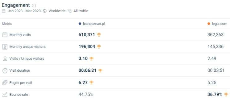 Widzimy to także po wynikach strony internetowej Lecha, która notuje bardzo dobre wyniki (na powyższym snipie z Similarweb porównanie ze stroną Legii, klubu o największym zainteresowaniu mediów, kiedy Lech nie gra w Europie).