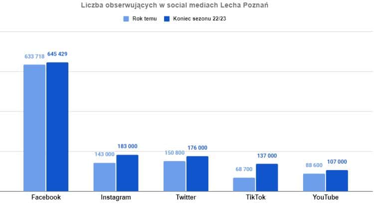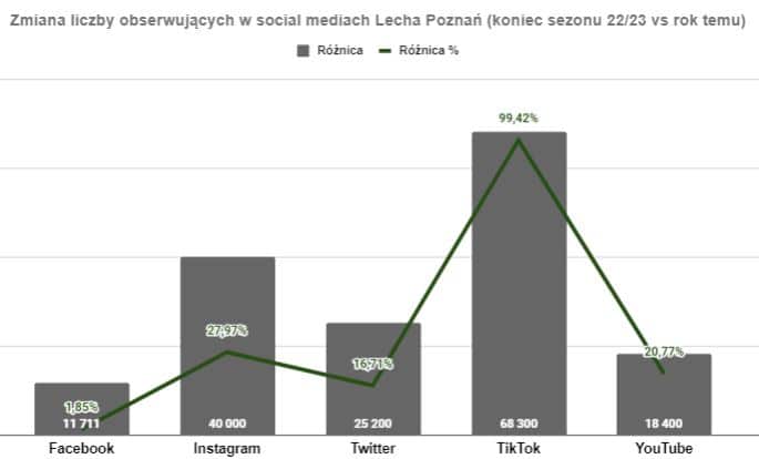 Największy wzrost procentowy odnotowałem na TikToku, co pokazuje, że jest to najszybciej rozwijająca się platforma. Przynajmniej do czasu poważnej konkurencji dla Twittera, gdzie każdy będzie zaczynał od nowa. Warto inwestować w zasięgi na tej platformie, bo dominują tam młodsi widzowie, którzy świetnie radzą sobie w Internecie. Lech zyskał tam prawie 70 tys. nowych obserwujących, tym samym podwajając wynik sprzed roku.
