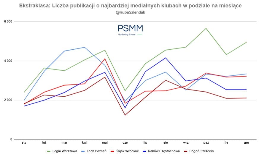Łącznie o klubach Ekstraklasy powstało ponad 413 tysięcy publikacji. Najwięcej, po 40 tys. ukazało się w maju, kiedy zakończył się poprzedni sezon ligowy oraz w październiku. Zdecydowanie najmniej publikacji, ok. 20 tys. miesięcznie pojawiło się w styczniu i czerwcu, czyli w okresach bez meczów. Średnia liczona per klub wyniosła 23 tysiące publikacji rocznie.