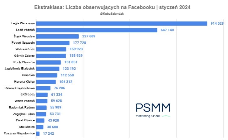 Pod względem liczby obserwujących na Facebooku dominuje Legia Warszawa z bardzo dużą przewagą nad drugim Lechem Poznań, który z kolei ma prawie trzykrotnie więcej obserwujących niż Śląsk Wrocław. Lech ma większą liczbę obserwujących niż Śląsk Wrocław, Pogoń Szczecin i Widzew Łódź łącznie. W tym zestawieniu wyraźnie odstaje Puszcza Niepołomice, której liczba fanów na Facebooku jest dwukrotnie niższa niż przedostatniej Stali Mielec, a także (niesklasyfikowanej w tym zestawieniu) Wieczystej Kraków.Łącznie kluby dysponują ponad 3 milionami fanów, z których część obserwuje więcej niż jeden klub. Trzech z dziesięciu kibiców polubił profil Legii Warszawa, a co drugi obserwuje Legię albo Lecha. Oficjalny profil Ekstraklasy polubiło 326 tys. kont.