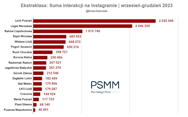 Na Instagramie najlepszy okazał się profil Lecha Poznań z liczbą interakcji przekraczającą 2.5 mln. Za nimi znalazł się profil Legii Warszawa oraz konto Rakowa Częstochowa, które wygenerowało mniej więcej połowę sumy interakcji Legionistów. Trzeci wynik Rakowa Częstochowa może tłumaczyć bardzo duża liczba dodawanych postów – prawie tysiąc w ciągu czterech miesięcy. To trzykrotnie więcej niż wynosi średnia. Pod względem stosunku interakcji do liczby postów częstochowianie zajmują 9. miejsce z wynikiem podobnym do Jagiellonii i Radomiaka.