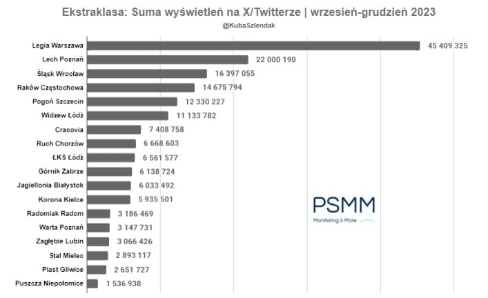 Na Twitterze/X kluby Ekstraklasy osiągnęły w analizowanym okresie 178 mln wyświetleń, z czego 25% należało do konta Legii Warszawa. Warszawianie mają także zdecydowanie najwięcej obserwujących, prawie 360 tys. To o 100 tys. więcej niż oficjalne konto Ekstraklasy. Średnio każdy klub w lidze osiągnął prawie 10 mln wyświetleń. Najsłabsze wyniki zanotowała Puszcza Niepołomice, Piast Gliwice i Stal Mielec.