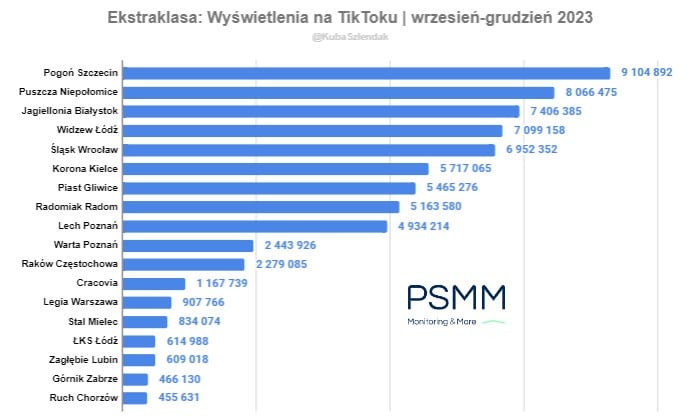 Ta platforma wymyka się schematom znanym z pozostałych social mediów. Najlepsze wyniki osiągnęły konta Pogoni Szczecin, Puszczy Niepołomice i Jagiellonii Białystok. Legia Warszawa, która wygrywa na pozostałych platformach, na TikToku jest dopiero trzynasta.