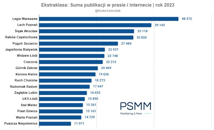 Drugie miejsce w całym 2023 roku zajął wspomniany Lech, z wynikiem zbliżonym do 40 tysięcy, więc o 19% niższym od Legii. Jednocześnie Poznanioki wypracowali 15% przewagi nad Śląskiem Wrocław. W ubiegłym roku liczba publikacji na temat klubu ze stolicy Dolnego Śląska zamknęła się liczbą 33 tysięcy.