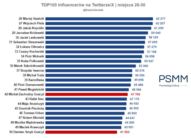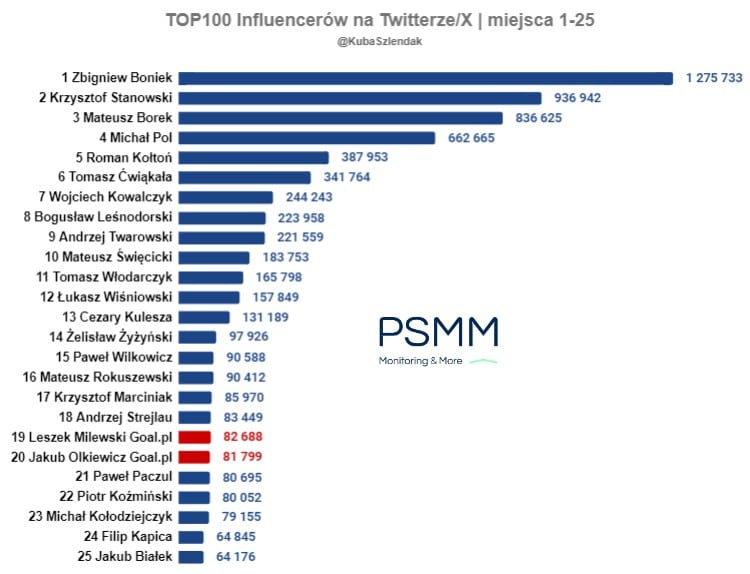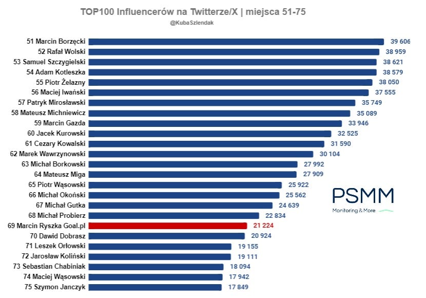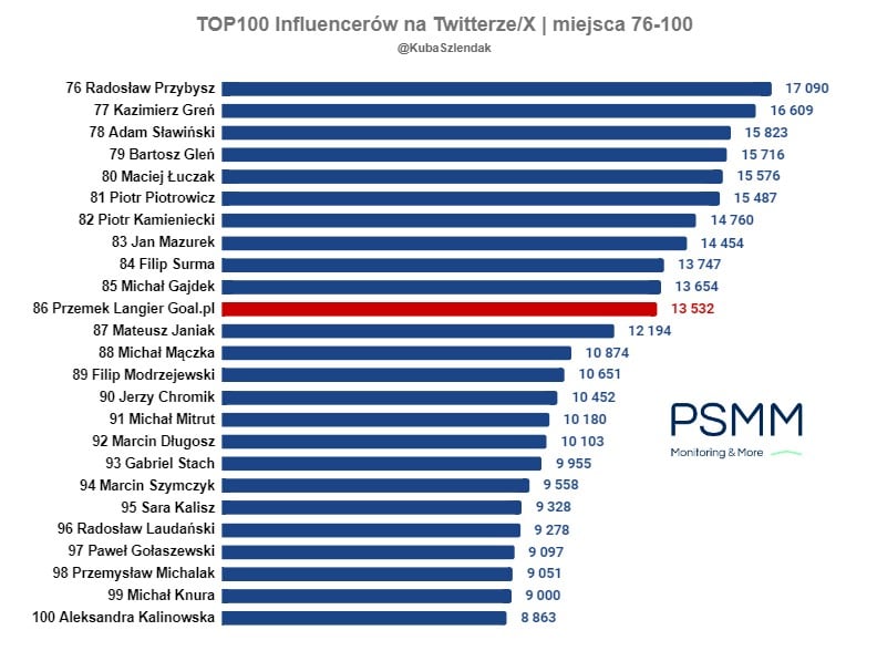 Zestawienie podzieliłem na cztery części po 25 kont w każdej. Najniższą liczbą obserwujących, która pozwalała na znalezienie się w rankingu dysponowała Aleksandra Kalinowska, czyli Dyrektor ds. komunikacji i marketingu Legii Warszawa. W zestawieniu na 86. miejscu został sklasyfikowany dziennikarz Goal.pl – Przemek Langier, którego znacie m.in. z wywiadów i vlogów.