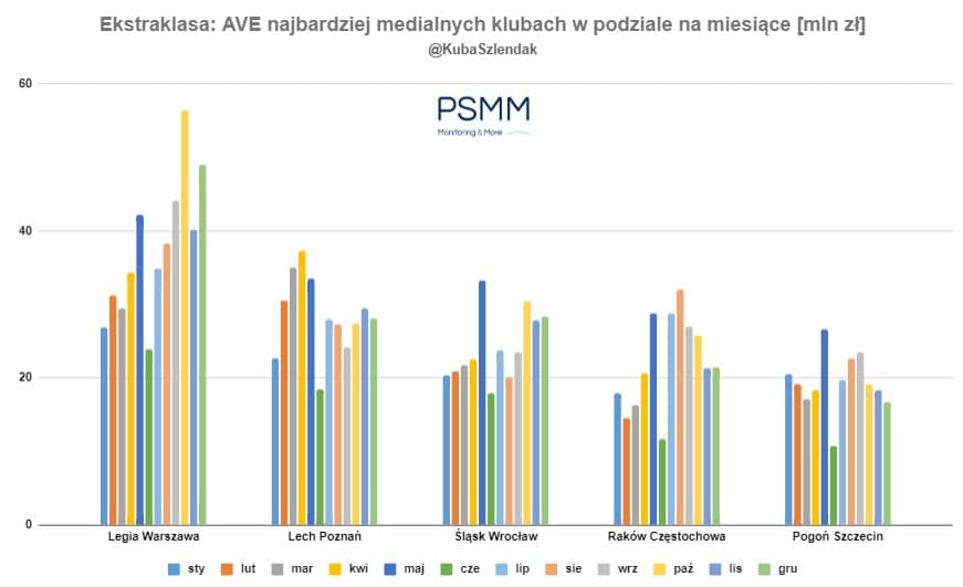 Także pod względem Advertising Value Equivalency (AVE) najlepsza była Legia Warszawa, przed Lechem Poznań i Śląskiem Wrocław, jednak różnice między poszczególnymi klubami były dość duże. Legia osiągnęła ekwiwalent reklamowy przekraczający 450 mln zł, ze średnią miesięczną na poziomie 37.5 mln zł. To wynik o 24% lepszy niż drugiego Lecha Poznań oraz o 40% względem Śląska Wrocław. Średni miesięczny ekwiwalent przekraczający 20 mln zł osiągnął jeszcze Raków Częstochowa. Średnia różnica między czołową szóstką wynosi 15%, a średnia różnica między 7. Jagiellonią Białystok a 11. Koroną Kielce to tylko 5%.
