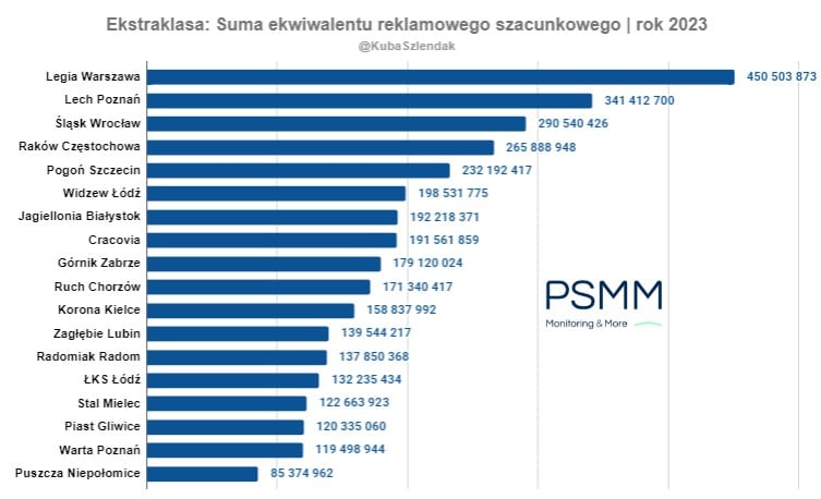 Łączna suma ekwiwalentu wszystkich klubów wyniosła ponad 3.5 miliarda złotych, z czego 13% wygenerowała Legia Warszawa. Tylko Warcie Poznań i Puszczy Niepołomice nie udało się osiągnąć średniej na poziomie 10 mln zł miesięcznie. Klub z Niepołomic wygenerował jedynie 85 mln zł AVE, co stanowi połowę wyniku Ruchu Chorzów oraz 29% ekwiwalentu Śląska Wrocław. Średnia w całym 2023 roku wyniosła niemal 200 mln zł.