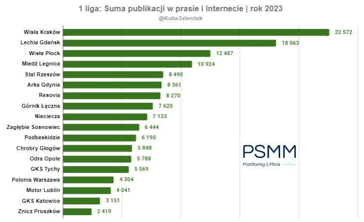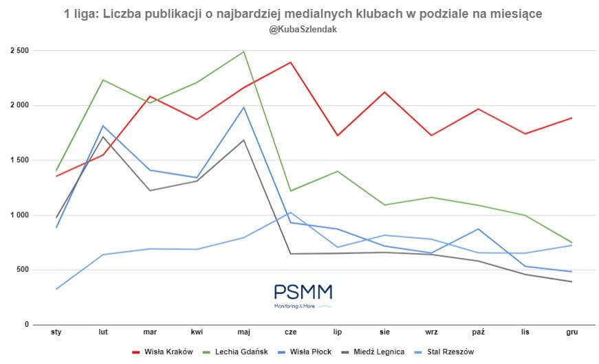 Na zapleczu Ekstraklasy zdecydowanie najbardziej medialnym klubem jest Wisła Kraków, która notuje wyniki na poziomie środka stawki najwyższej ligi. O klubie z Krakowa ukazywało się średnio 2 tys. publikacji miesięcznie, czyli prawie trzykrotnie więcej niż o kolejnym klubie, który w 1. lidze spędził cały rok. To także dwukrotnie więcej niż o 3. w zestawieniu Wiśle Płock. Kiedy spojrzymy na kluby z dwóch najwyższych lig łącznie, Wisła znajduje się na 8. miejscu z niewielką stratą do 6. Jagielloni Białystok oraz z nieznaczną przewagą nad 9. Cracovią. Wynik Białej Gwiazdy jest lepszy niż 11 klubów Ekstraklasy.