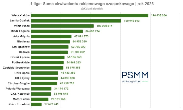 Także pod względem ekwiwalentu reklamowego Wiślacy nie mieli sobie równych. Wynik w okolicach 200 mln zł w 2023 roku oznacza, że Wisła Kraków zajęłaby 6. miejsce pod tym względem w Ekstraklasie. Wynik klubu z Krakowa jest o 33% wyższy niż Lechii Gdańsk oraz prawie dwukrotnie wyższy niż trzeciej w klasyfikacji Wisły Płock. Warto także zauważyć, że Biała Gwiazda spędziła na zapleczu cały rok i jej AVE rozłożyło się po połowie w obu półroczach. Wyniki Lechii i klubu z Płocka zostały w 65% osiągnięte wiosną, czyli w Ekstraklasie. Licząc kluby, które cały 2023 rok spędziły w 1. lidze wynik Wiślaków jest jeszcze bardziej okazały, bo aż trzykrotnie wyższy od drugiej pod tym względem Arki Gdynia.