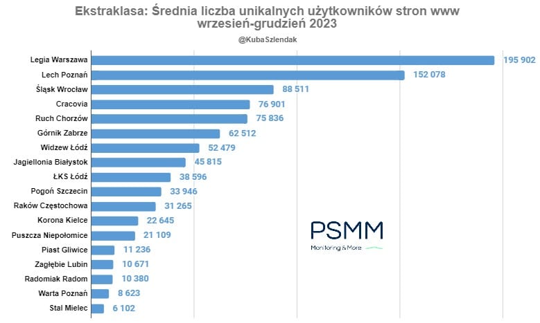 W okresie od września do grudnia średnia liczba unikalnych użytkowników wszystkich stron internetowych klubów Ekstraklasy wyniosła 944 tys., a średnia 52 tys. Zdecydowanie najlepsze wyniki notują Legia Warszawa i Lech Poznań. Wynik Legionistów jest o ponad 40 tys. lepszy od wyniku klubu z Poznania. Z kolei wynik Lecha jest aż o 60 tys. wyższy niż trzeciego w zestawieniu Śląska Wrocław.
