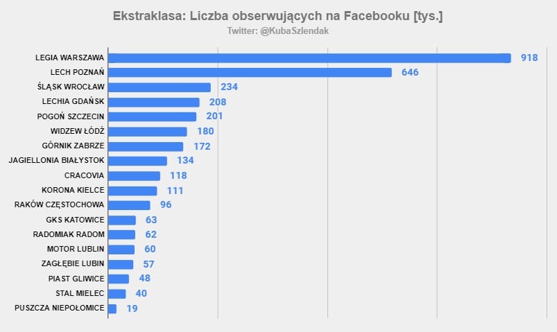 Największą bazę kibiców w social mediach ma Legia Warszawa, która w tym sezonie może przekroczyć 2 mln obserwujących. Oczywiście nie są to unikatowe osoby, tylko liczba kont. Wśród nich jest duża część osób, które śledzą losy klubu na kilku kanałach jednocześnie, a liczą się kilkukrotnie.