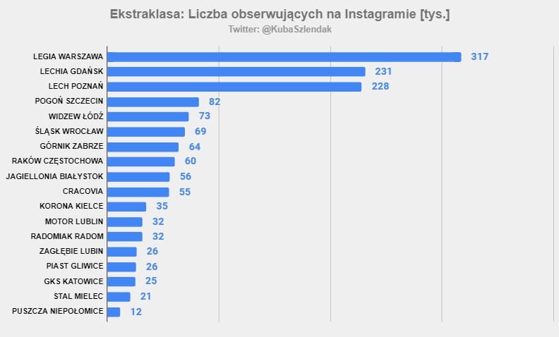 Podobnie do Facebooka, na przodzie Legia Warszawa z ponad 300 tys. obserwujących, ale na drugim miejscu nie ma Lecha Poznań. Zamiast poznaniaków jest Lechia Gdańsk, której social media, głównie Instagram, został sztucznie napompowany po transferze piłkarza z Indonezji w 2018 roku – Egy’ego Maulana Vikriego. Wielkiej kariery sportowej w Gdańsku nie zrobił i jego kontrakt został rozwiązany, co nie spodobało się kibicom z Azji. W ciągu kilku dni profil stracił ponad 20 tys. obserwujących, a post z informacją był bardzo mocno krytykowany przez tamtejszych kibiców.